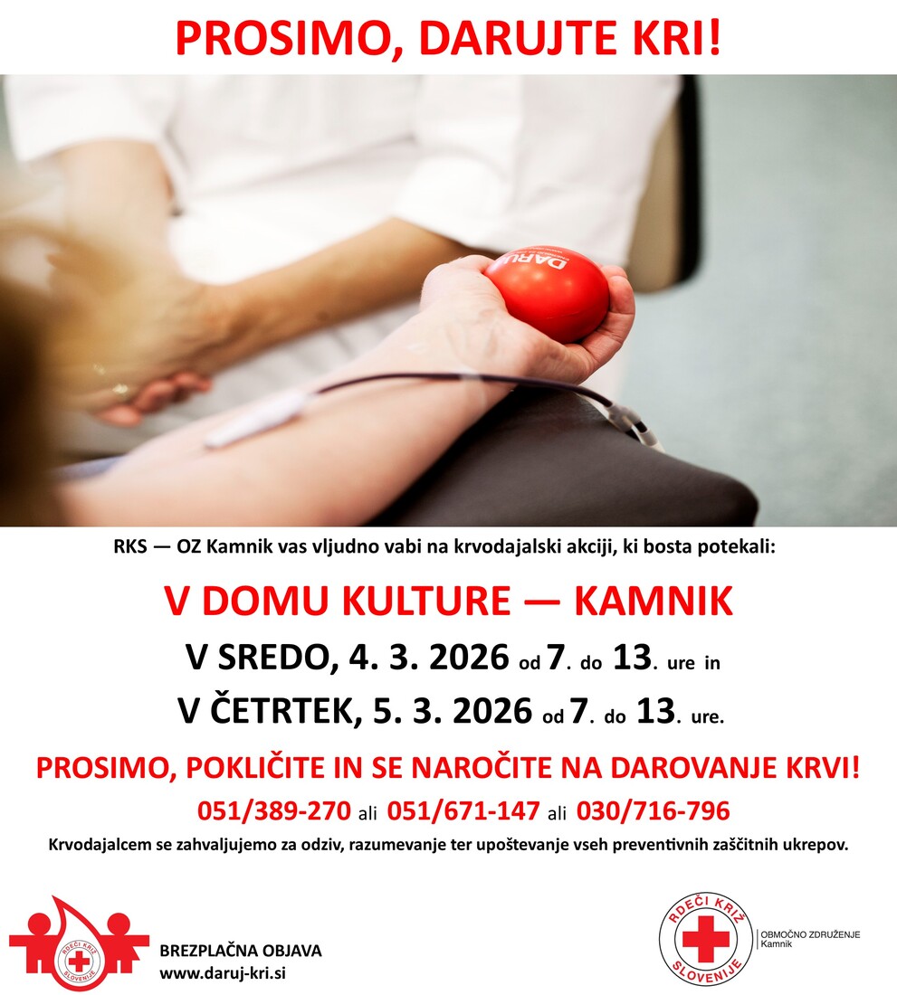 Območno združenje Rdečega križa Kamnik in Zavod za transfuzijsko medicino Slovenije vas vabita na KRVODAJALSKO AKCIJO, ki bo 4. in 5. marca med 7. in 13. uro v prostorih Doma kulture Kamnik.