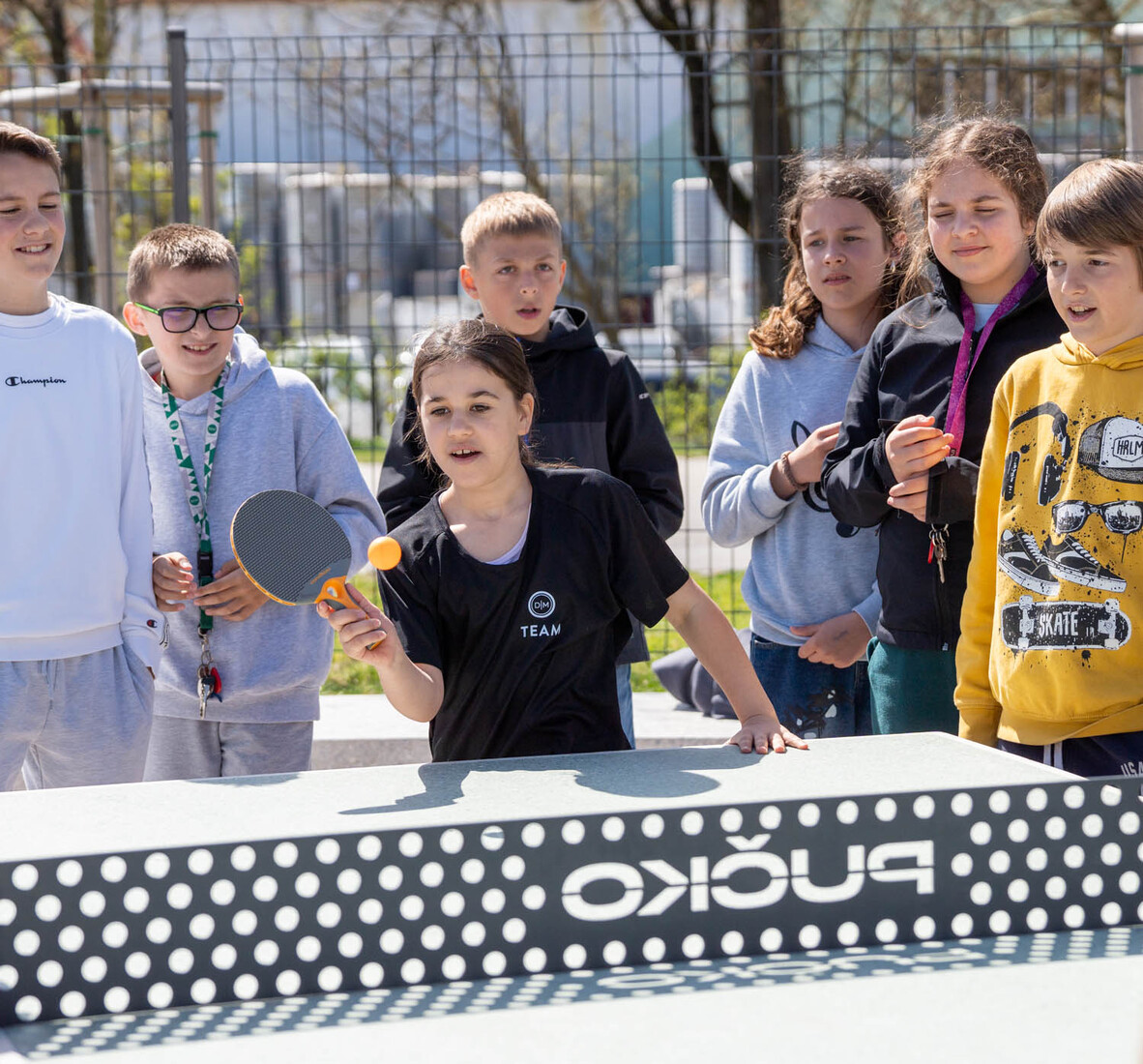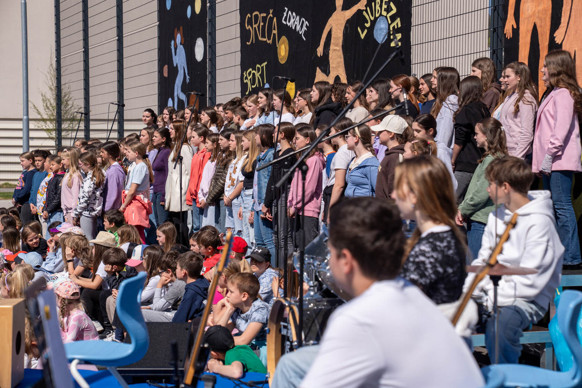 Program so pripravile učenke in učenci Osnovne šole Frana Albrehta Kamnik in Osnovne šole Toma Brejca. Z velikim navdušenjem smo prisluhnili bogatemu glasbenemu programu, v katerem se je pet zborov obeh šol združilo v enoten, mogočen in ubrani glas ob spremljavi skupine, ki je napolnila prostor s posebno energijo. Dogajanje je čudovito dopolnila raznolika plesno-dramska in akrobatska točka, ki nas je iskreno očarala in pokazala izjemne spretnosti naših najmlajših ter hkrati razkrila, kako vsestransko in živahno bo novo igrišče služilo svojemu namenu. S štafeto in prerezom traku pa smo v uporabo predali novo igrišče. Nadobudni otroci so s simbolnimi podajami žog osrednjim gostom pokazali povezanost, sodelovanje in skupno skrb za prostor.