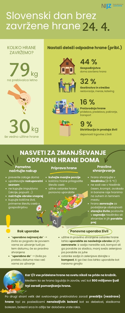 24. aprila obeležujemo slovenski dan brez zavržene hrane. Tudi na NIJZ se pridružujemo pobudi za zmanjšanje zavržkov hrane. Ker po podatkih sodeč največ zavržkov hrane pridelamo v gospodinjstvih, je tukaj največja priložnost za napredek - z majhnimi, a doslednimi koraki v vsakodnevnih navadah pri nabavi, pripravi, shranjevanju in ponovni uporabi hrane. Ob tej priložnosti želimo poudariti tisto, kar je ključno pri spreminjanju odnosa v smeri manj zavržkov hrane v slovenskih domovih.